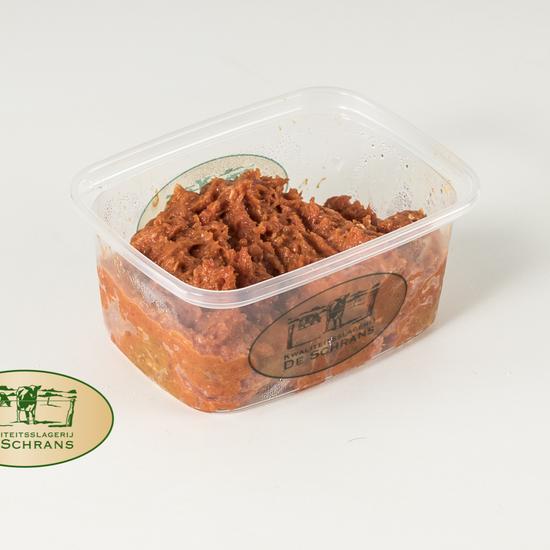rundvlees, water, zout, raapolie, eigeel, suiker, vloeibare suiker, rode peper, maltodextrine, glucose-fructosestroop, E160c, E162, E160a(ii), natuurazijn, E120, E150d, uipoeder, E150c, gehydrolyseerd eiwit (soja, maïs), maiszetmeel, E202, zonnebloemolie, E211, melasse, E412, E415, tomatenpuree, E410, brandewijnazijn, knoflookpoeder, gemodificeerd zetmeel (maïs), E260, E330, invertsuikerstroop, paprikapoeder, uien, E385, soja, peper, gistextract, mosterdzaad, sojabonen, foelie, dextrose, selderij, nootmuskaat, koriander, tarwe, gemberpoeder, mais, gefermenteerd rijstextract, kruidnagel, natuurlijk ui aroma en pimentMISSCHIEN IS DIT OOK IETS VOOR U?